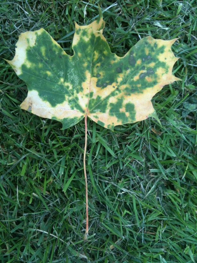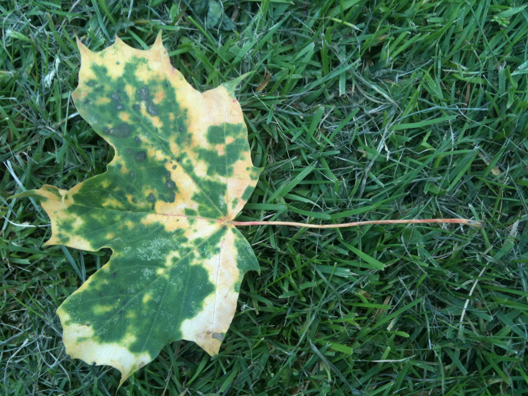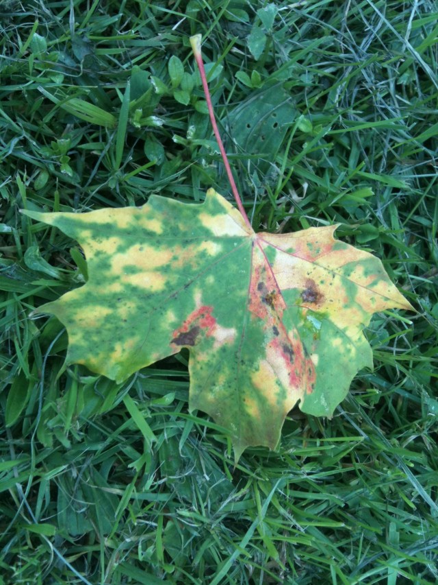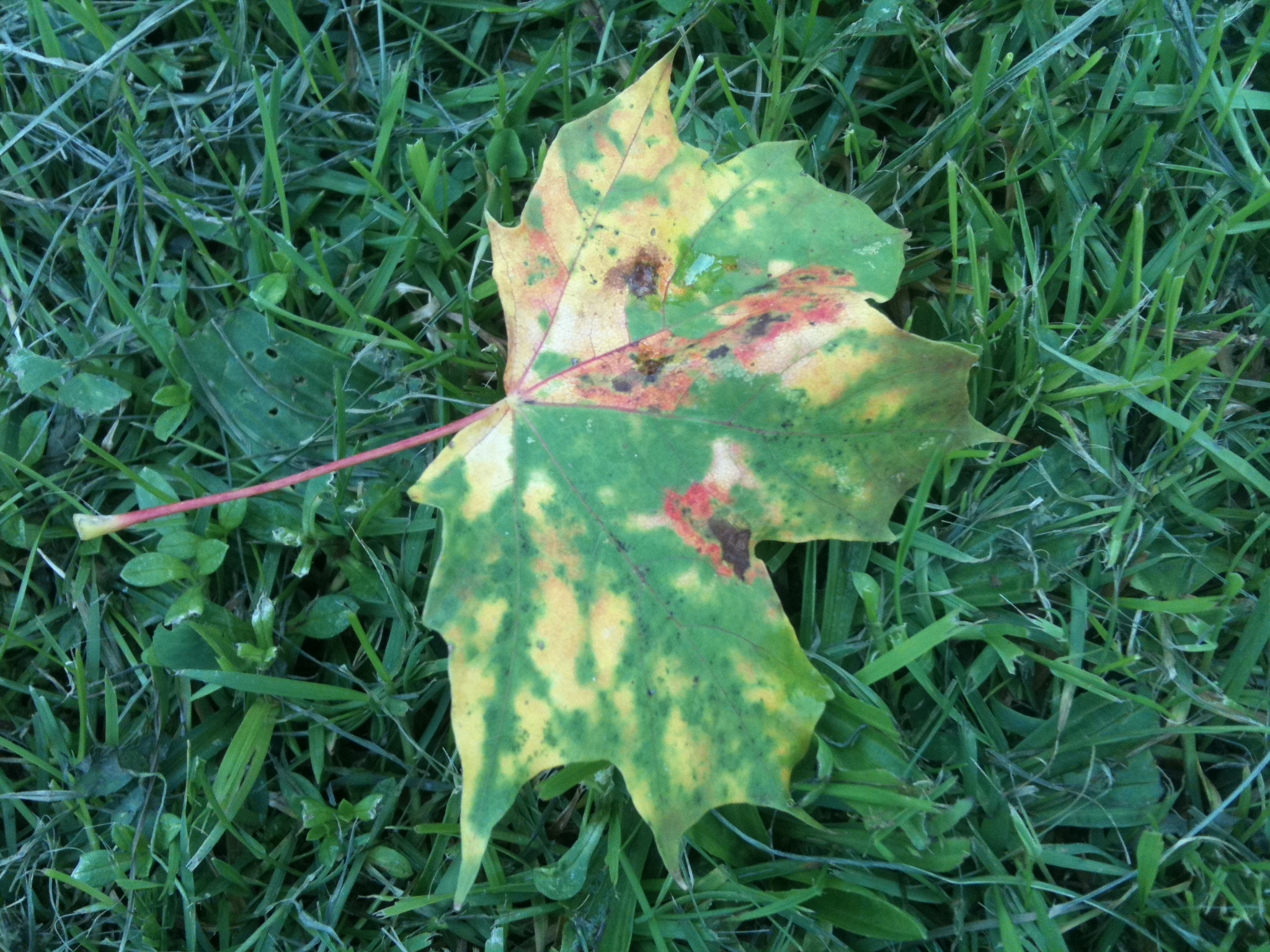 Just a few cellphone pictures from a quick walk to the mailbox to post my tax return. I discovered the first few coloured leaves on the ground. Fall is coming.