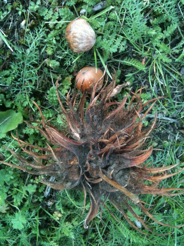 There are a couple of hazelnut trees in our street. When I was a little girl, I would collect the husks and my grandmother would dry them on her oven until the nuts fell out. People don’t seem to do this anymore.