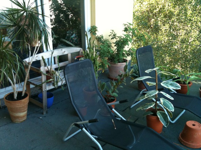 There will be a railing at some point (next week, according to the railing man but I’ll believe it when I see it) and also floor boards. The difficulty is in finding a suitable domestic wood — I don’t want any tropical timber in the house. In the meantime, we’ve been enjoying the terrace in its somewhat unfinished state (giving our building-site manager nightmares in the process because he keeps thinking we’ll have too much to drink and fall off — I guess we don’t strike him as the most responsible clients he’s ever had). The downside is that it’s too hot for most plants in the summer as the tarpaper heats up a lot.