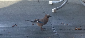 A jay (Garrulus glandarius) has taken to hanging out in my famous birch tree and so I’ve been spreading nuts on the unfinished terrace to attract him. It’s taken a few days but it seem that he has finally figured out that this buffet is intended for him.