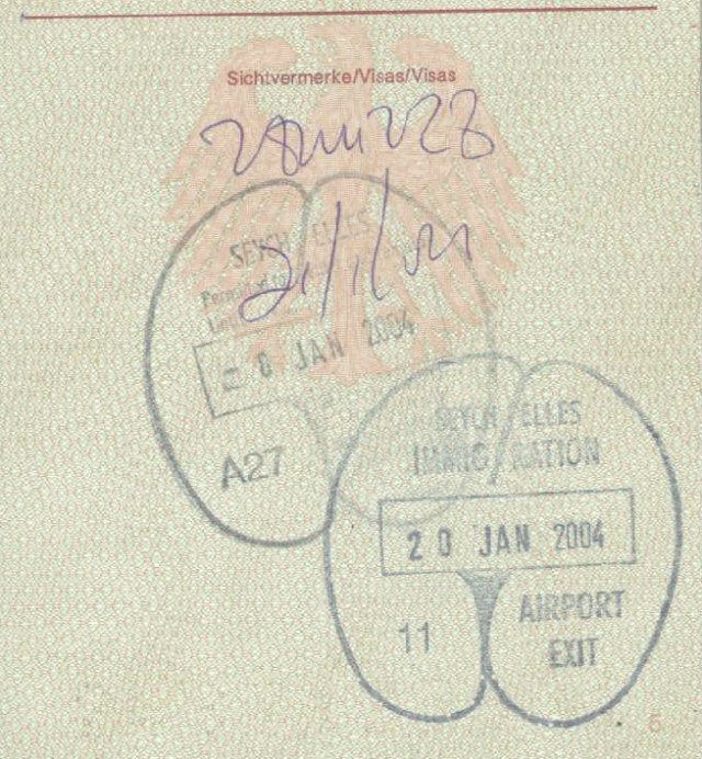 My favourite stamp from my old passport. It's supposed to show the fruit of the Coco de Mer, the Seychelles' famous endemic palm tree. But you're forgiven if that was not the first association that came to your mind.