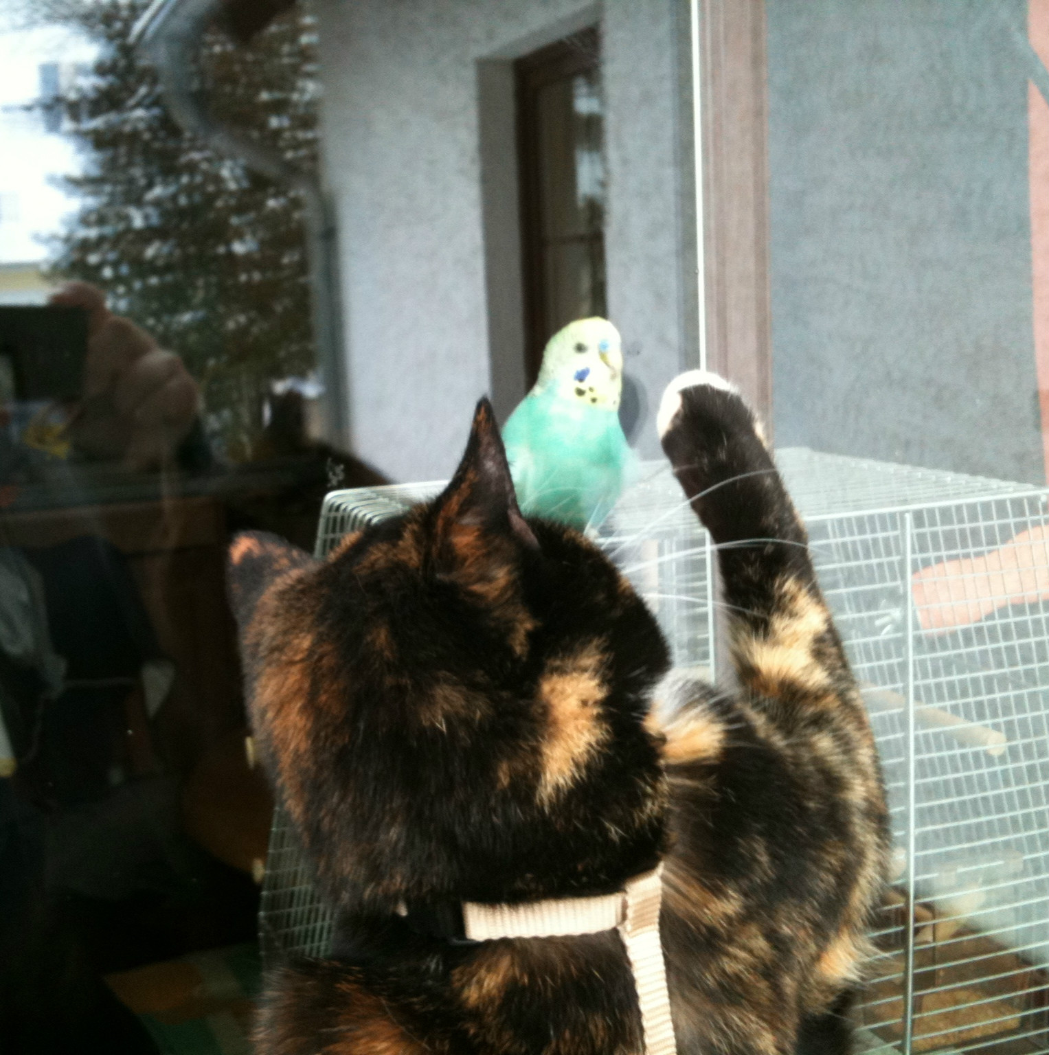 The bird isn’t stupid and knows very well how windows work — something Isla still had to learn when this photo was taken (in 2009, not long after she came to live with us rule our lives)