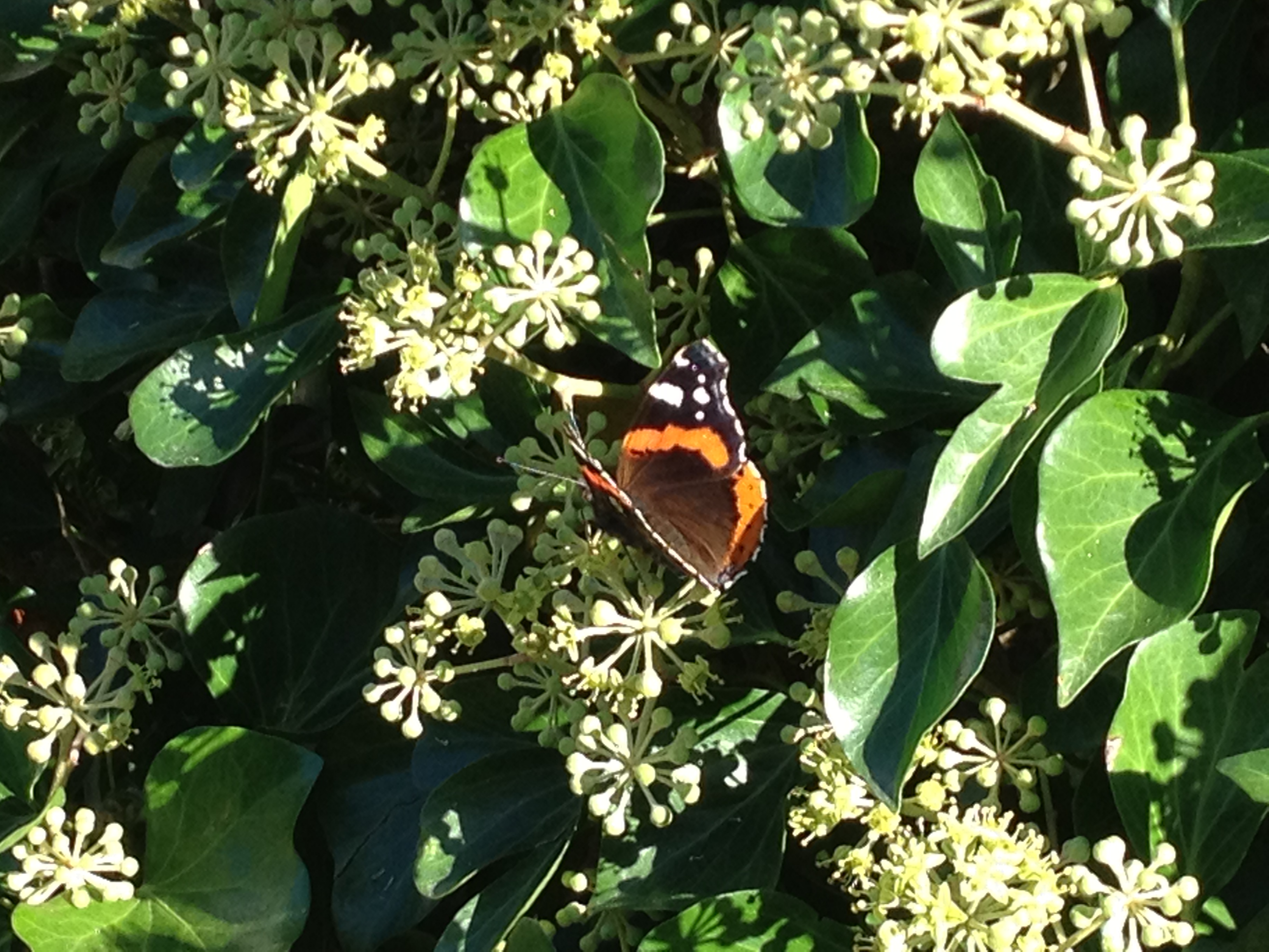The Husband and I snuck off and went diving yesterday, so today we were pretty much chained to our desks to make up for it. But there was, of course, time for a couple of walks with Isla (she wouldn’t let me get away without those!) and this cellphone snapshot of one of the many guests in the ivy. I love the heavy honey-smell of ivy blossoms and the bees and butterflies clearly agree.