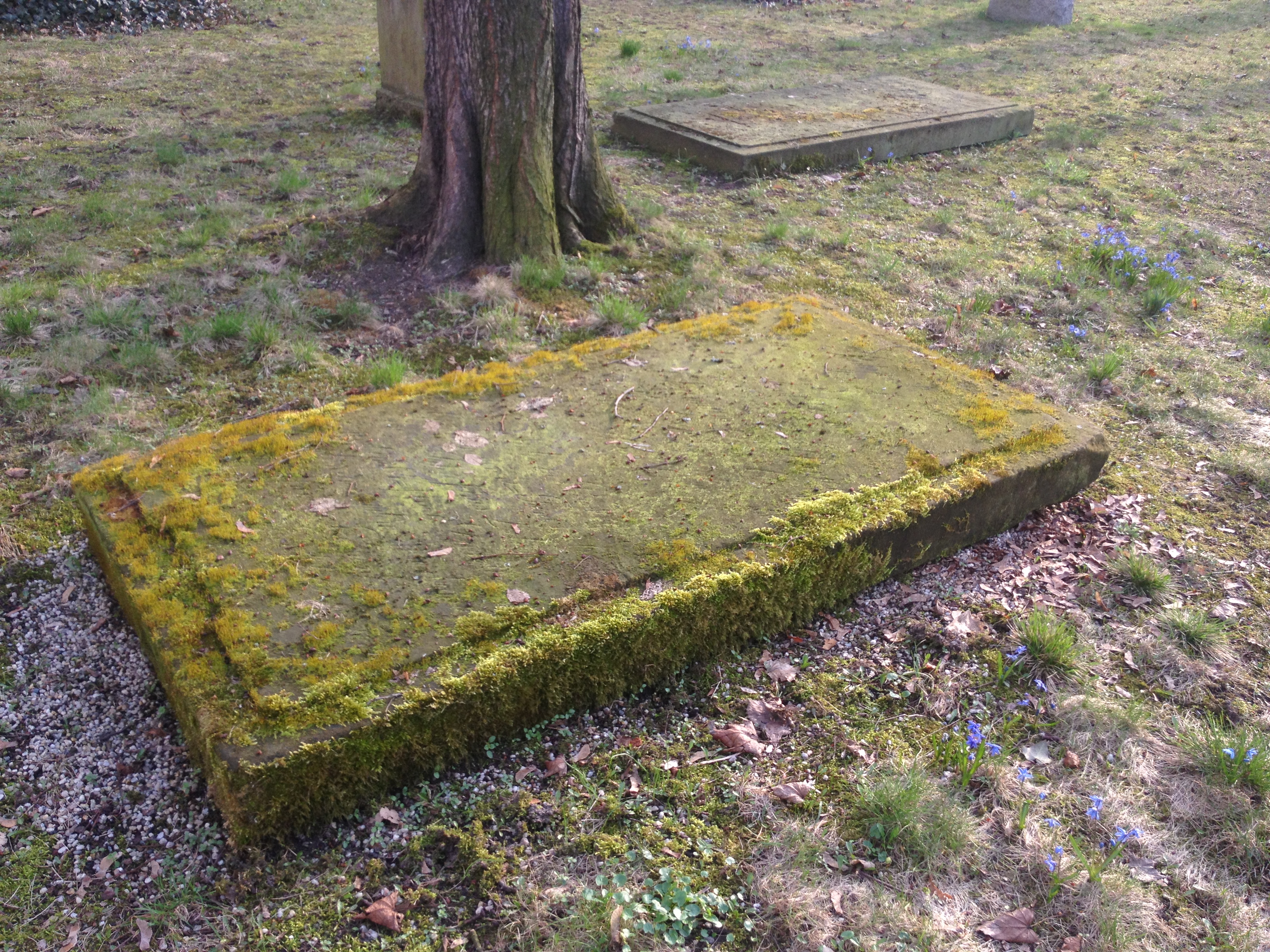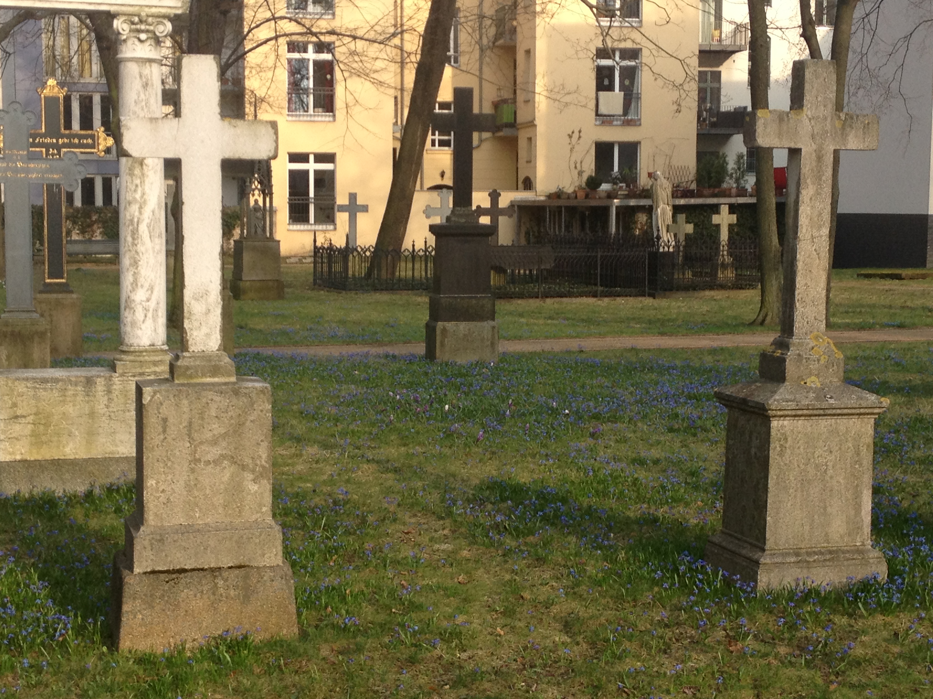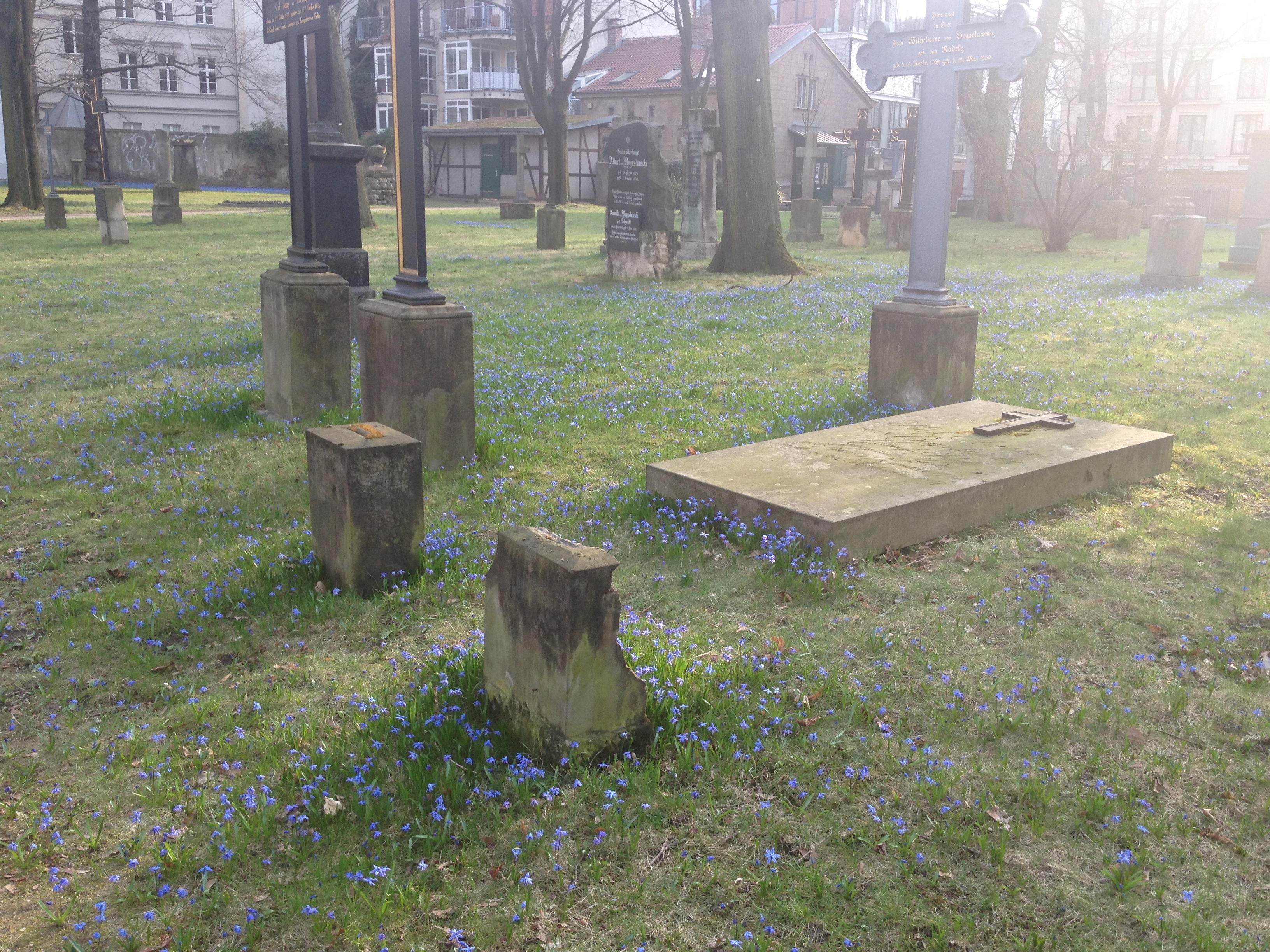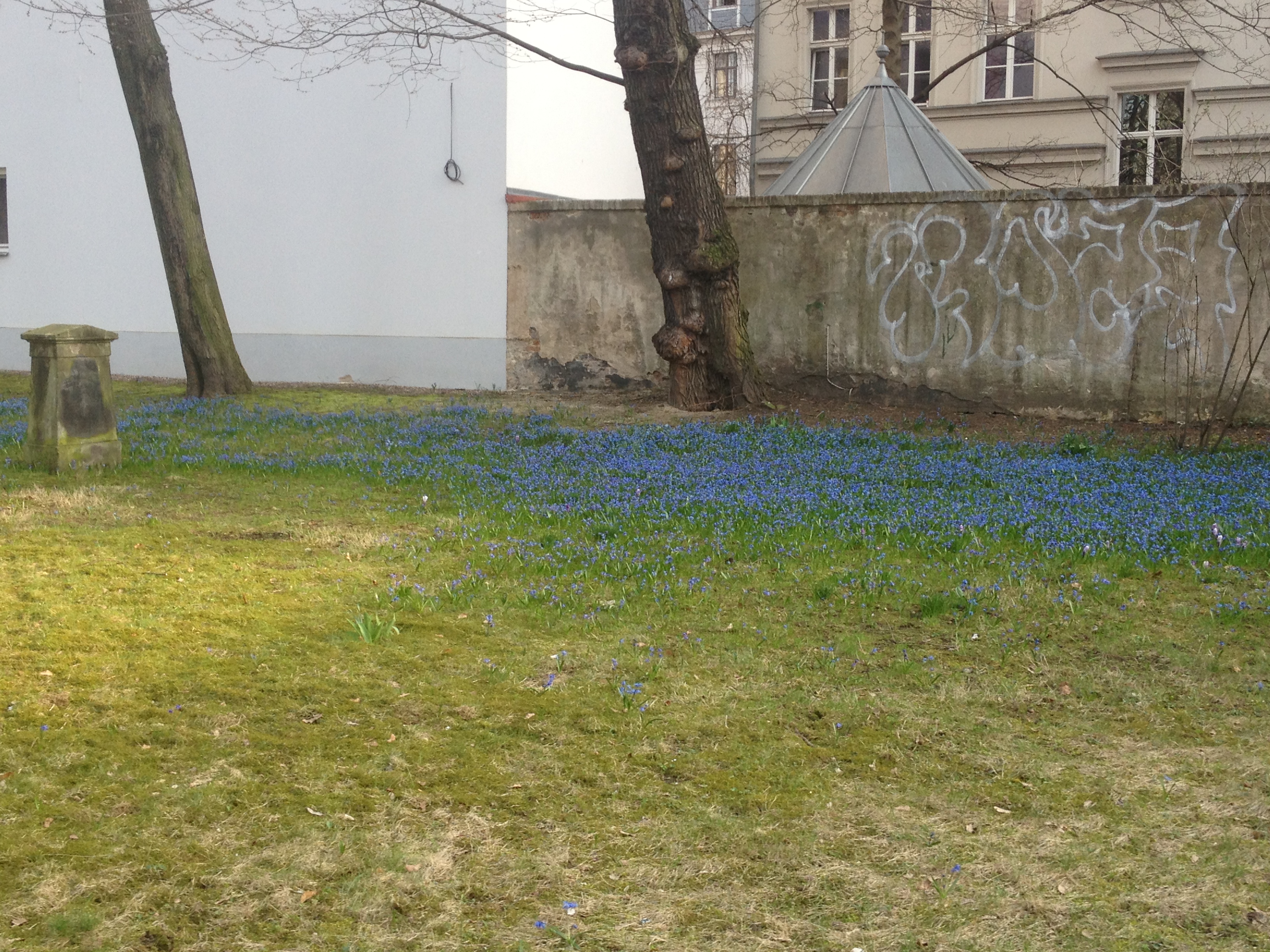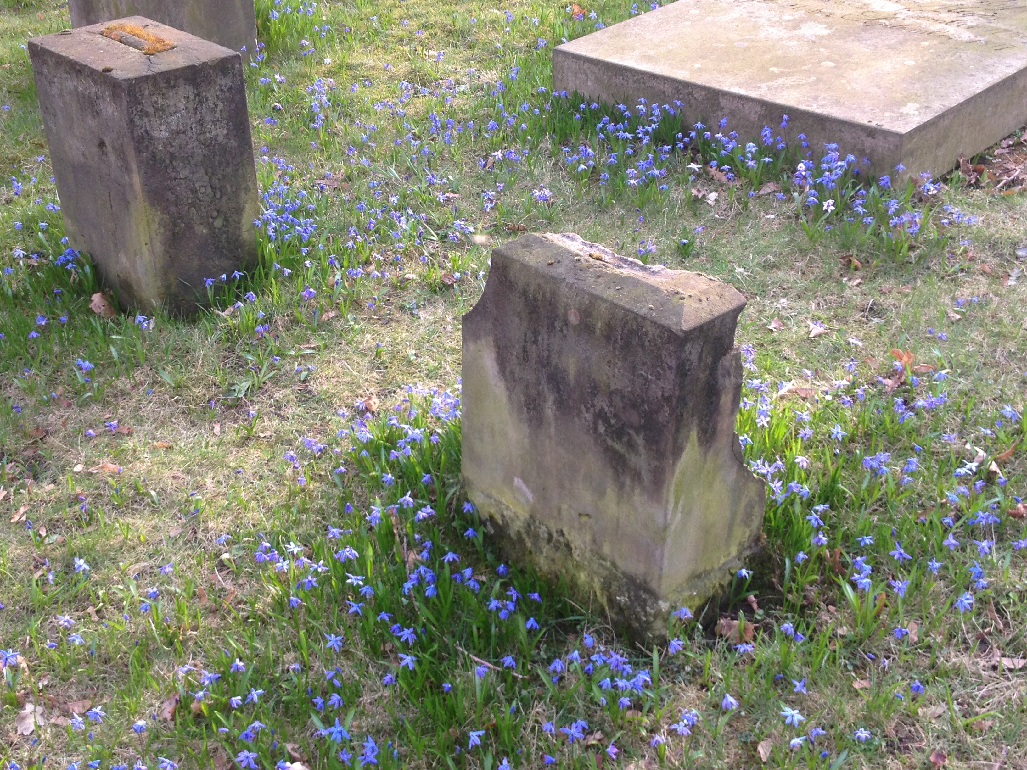 The other day, I was running some errands in town and cut through this old inner-city cemetery (est. 1706 but no longer in active use). I love how spring has painted it blue: (Cellphone snapshots only, sorry.)
