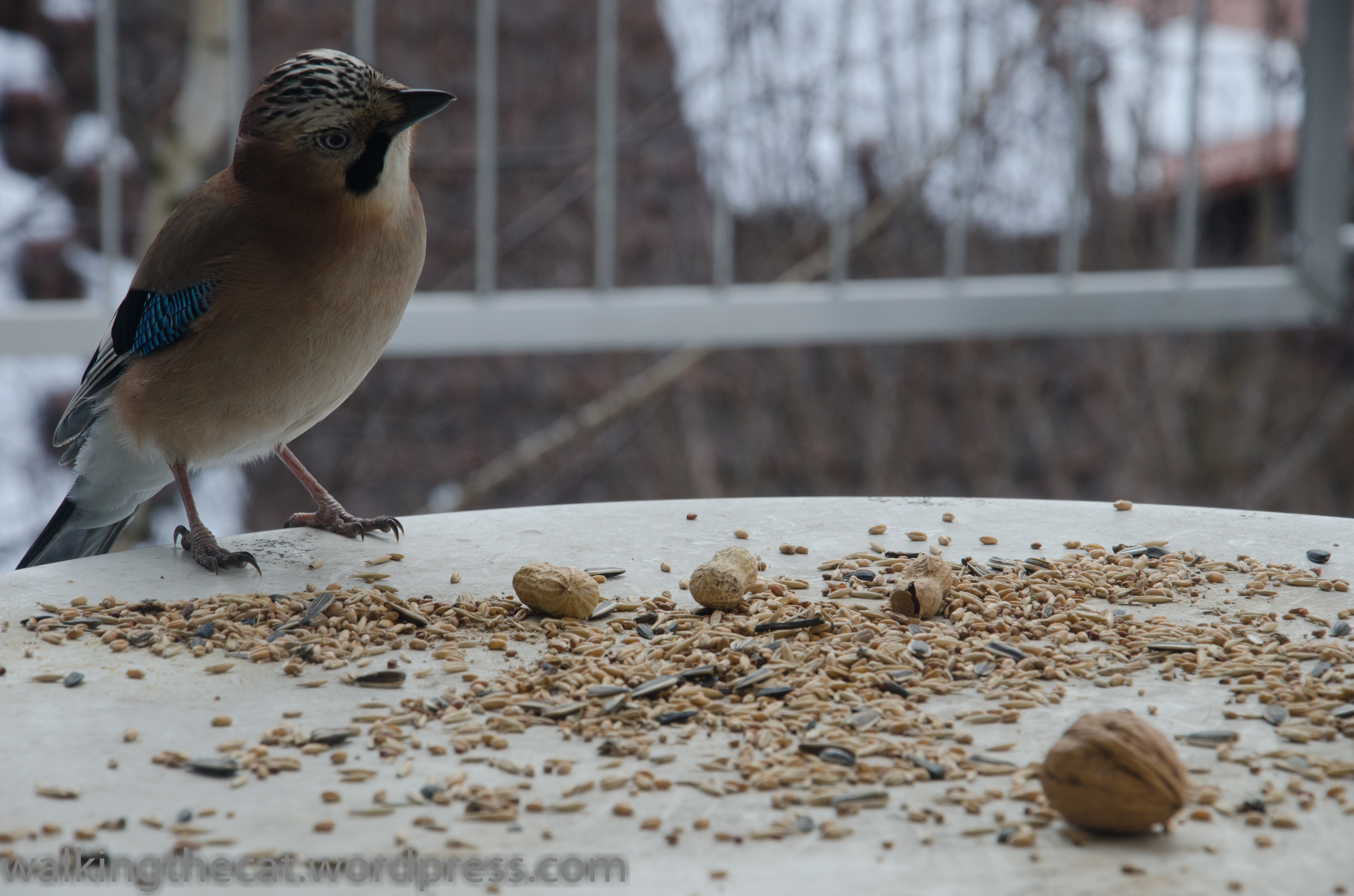 Last year I wrote about my efforts to help a jay through the winter by feeding him peanuts. I’m happy to report that they were successful — not only did the jay come back this winter, he also brought two friends.