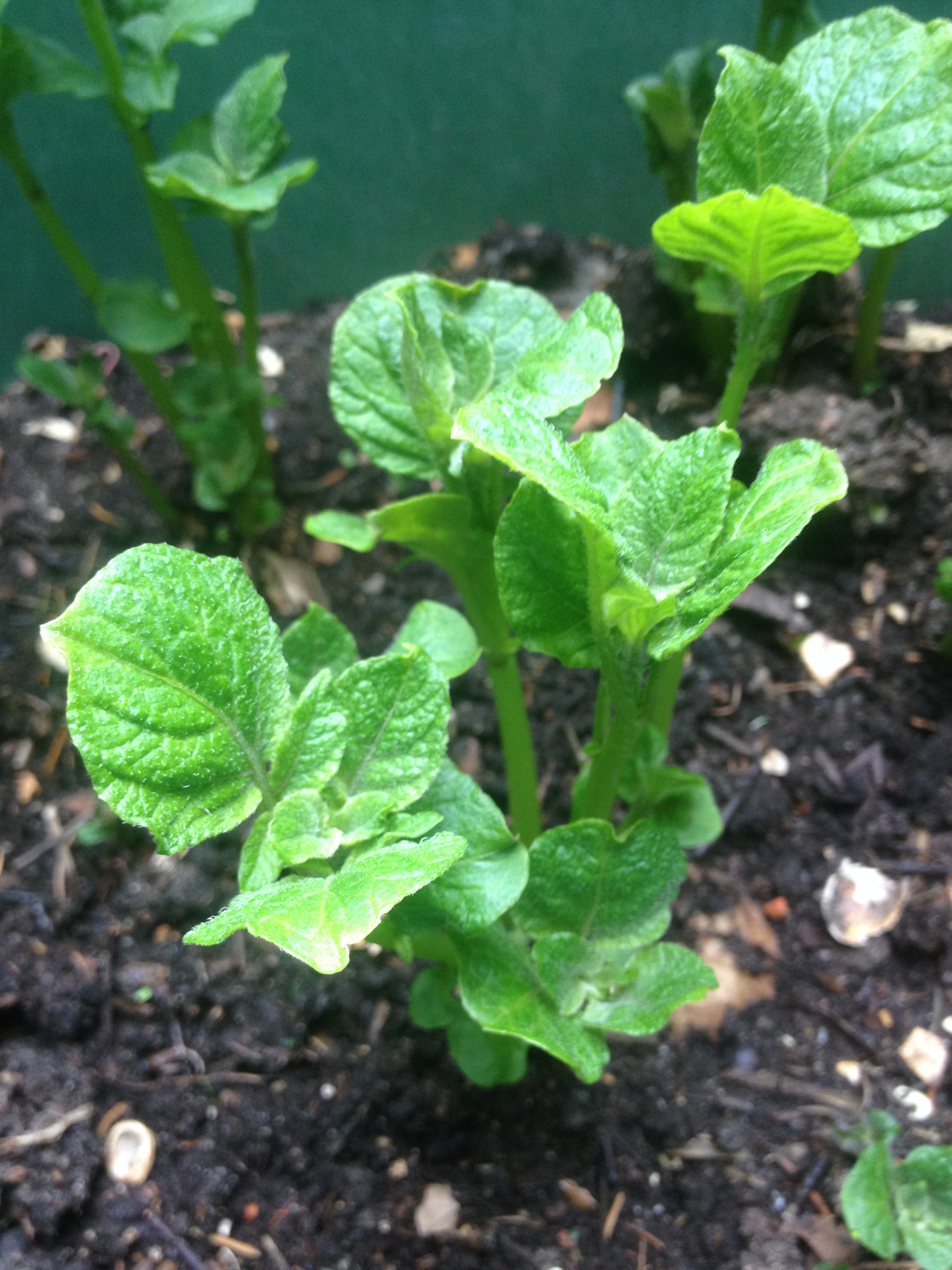 photoI’ve now covered about half of this growth with additional soil from the compost and will keep doing so over the summer. The idea is that the plants will grow a new layer of potatoes in each layer of soil. We’ll see if that works — I’ll report back.