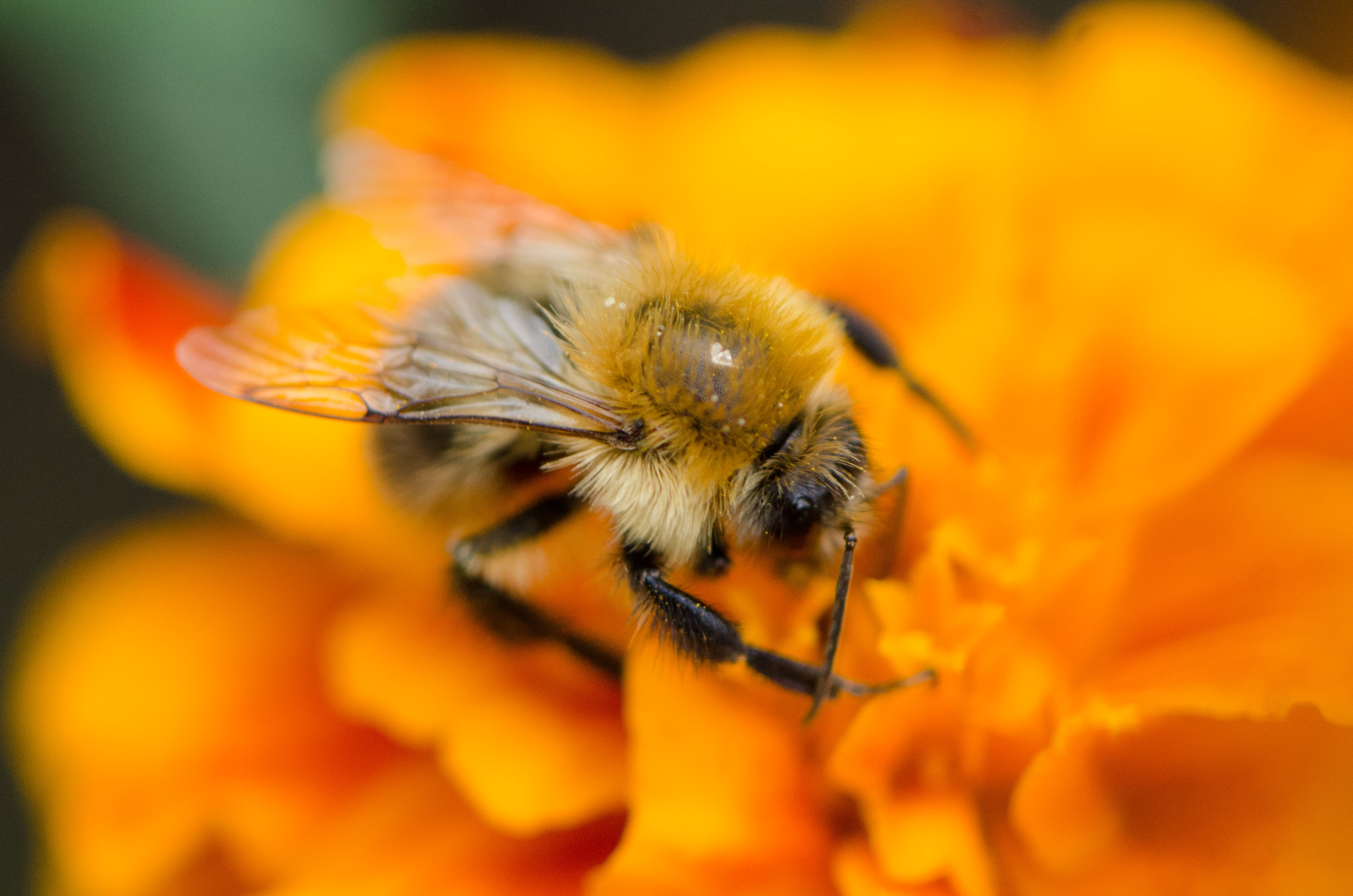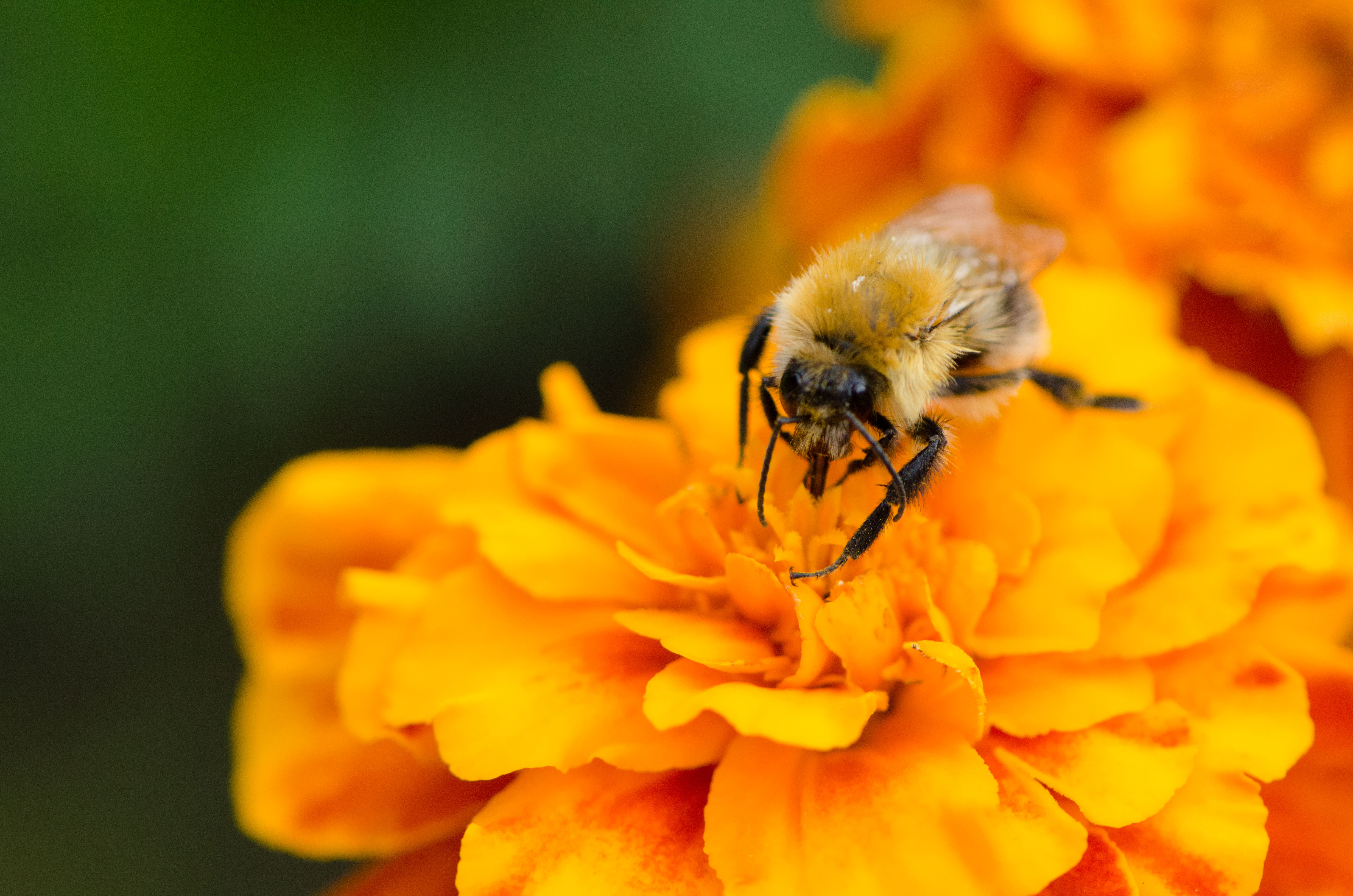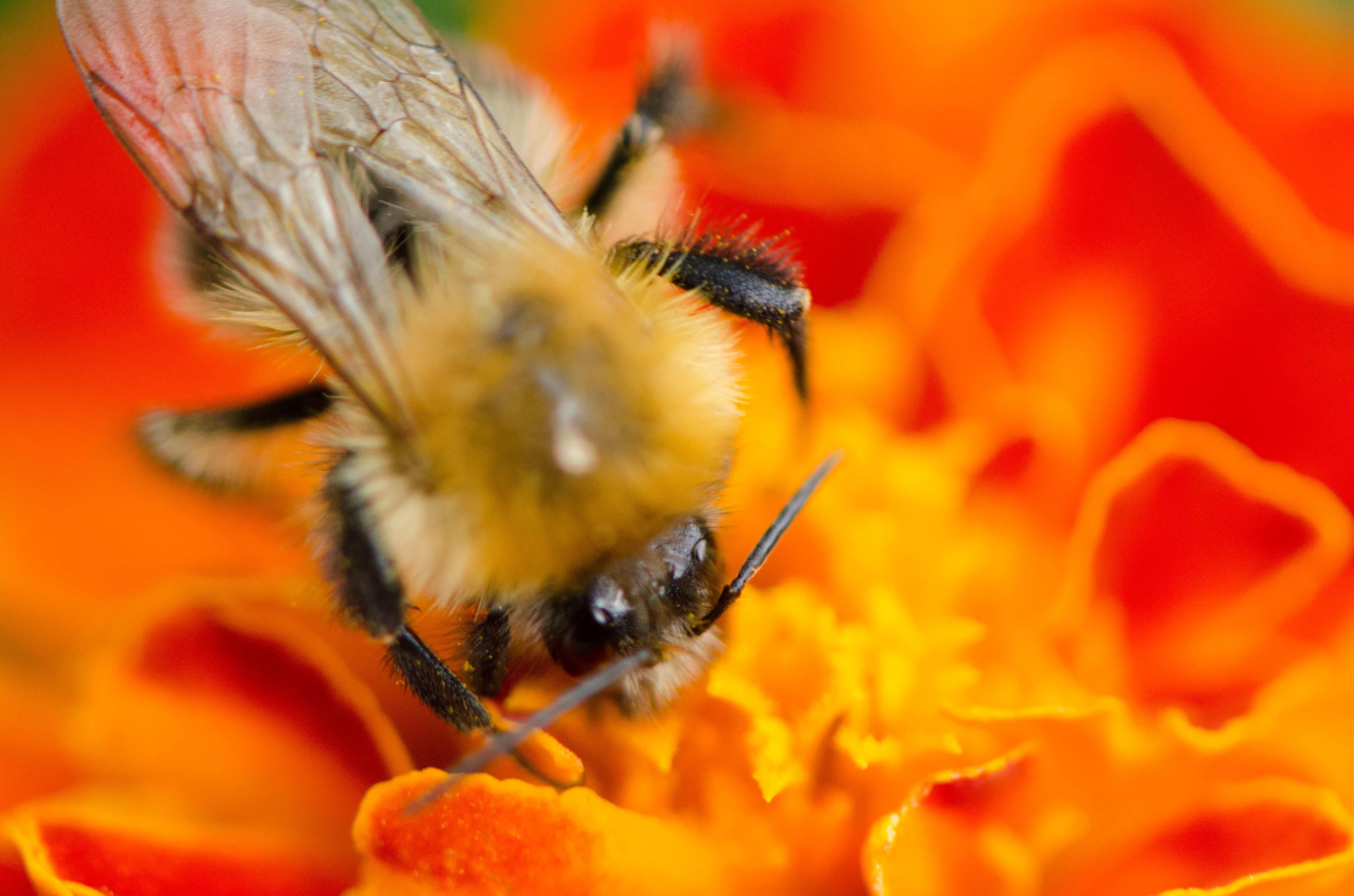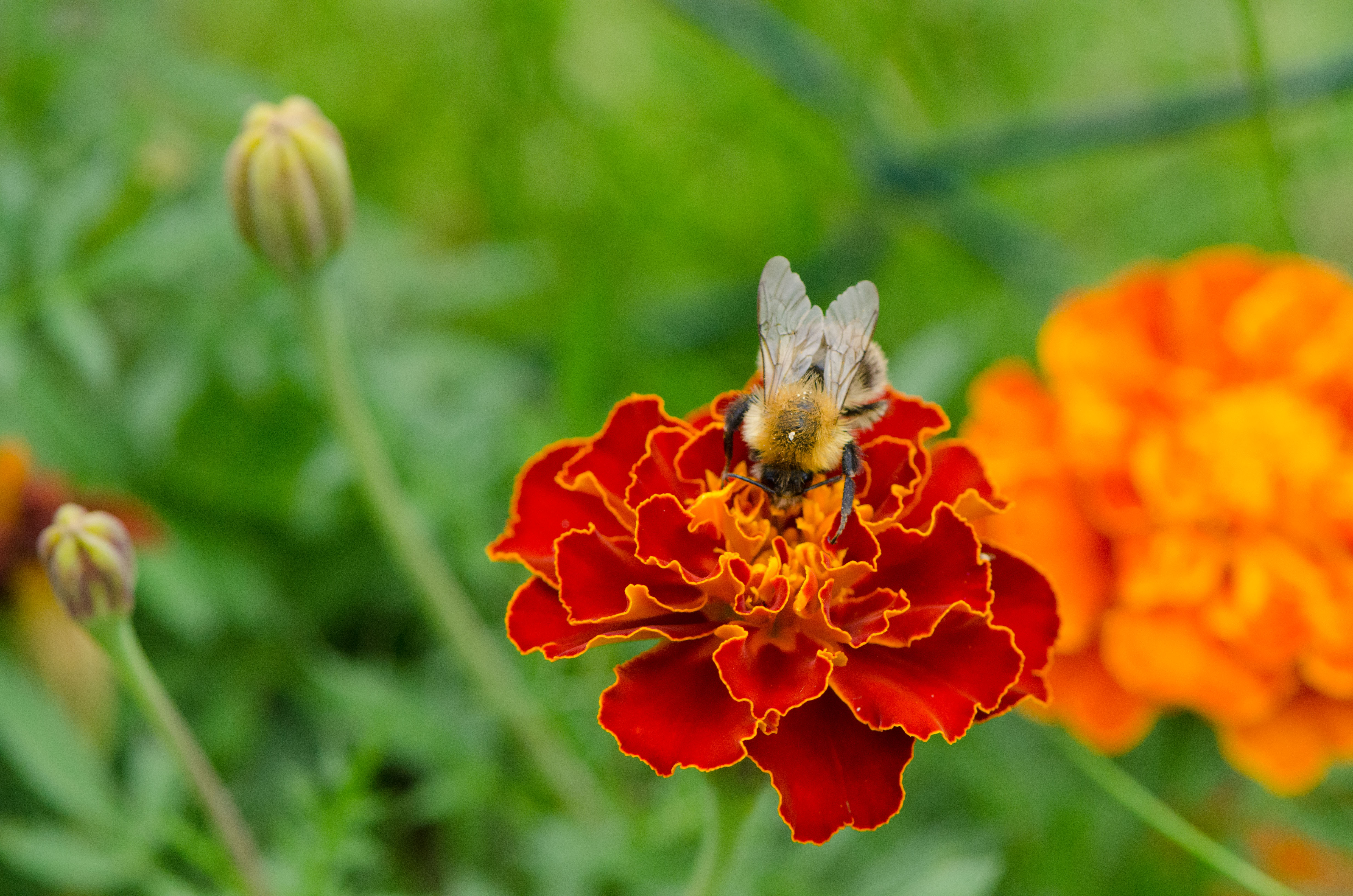 On one side of our garden, along the fence to a neighbour’s driveway, there is a patch of marigolds that usually does not get a lot of attention. By us humans, that is, because this winged visitor could not quite get enough of it.